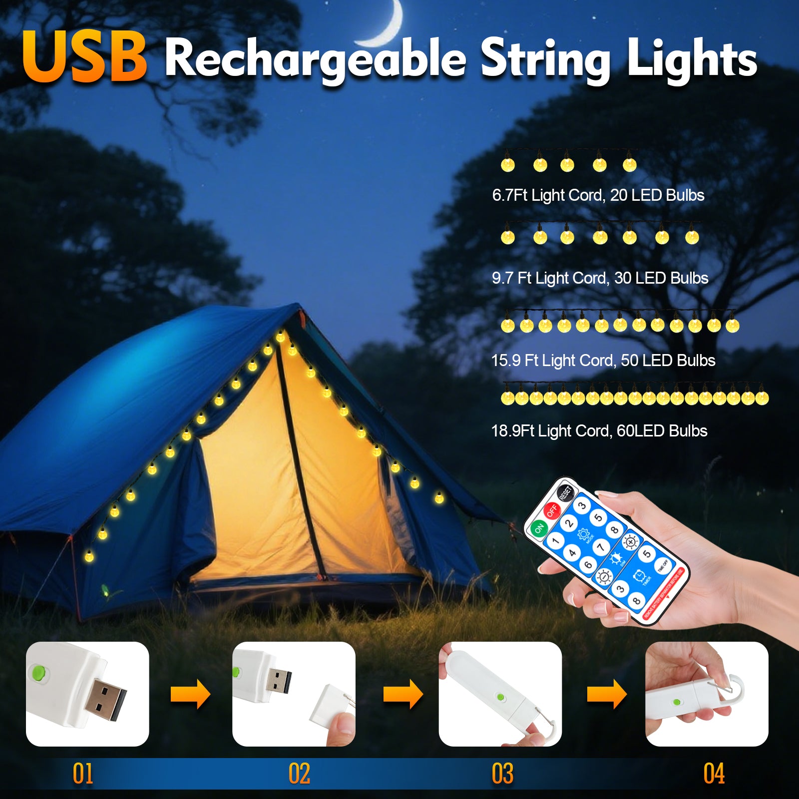 • 8 Different Modes & Memory Function: The USB rechargeable patio lights feature 8 different lighting modes: In waves, Combination, Sequential, Slo-glo, Chasing/Flash, Slow Fade, Twinkle/Flash, and Steady On. Built-in memory chip to save your last mode setting. Perfect for various occasions and events, including camping, Christmas, holidays, and parties.